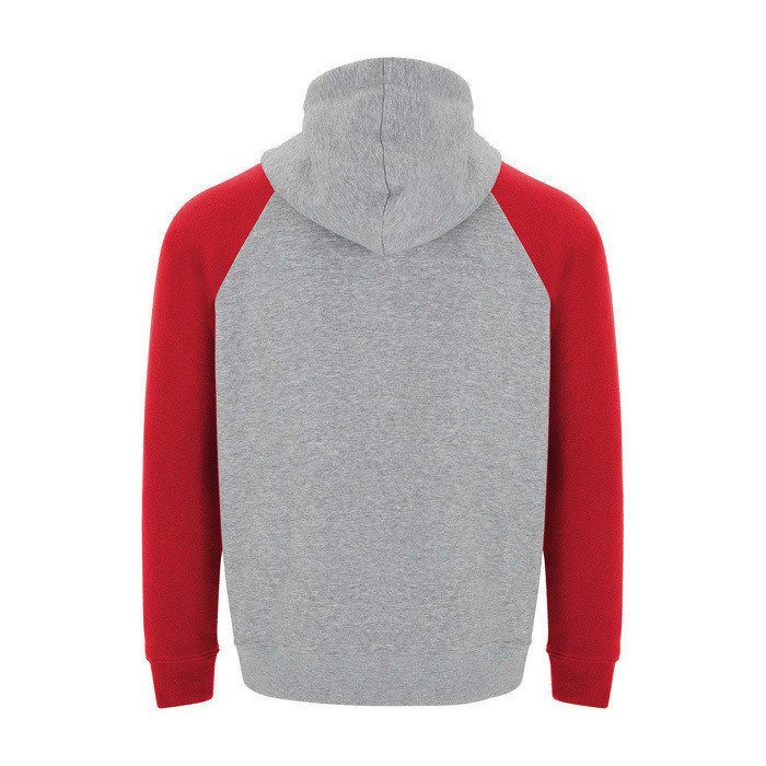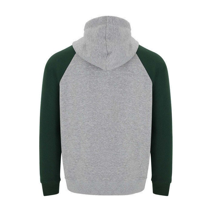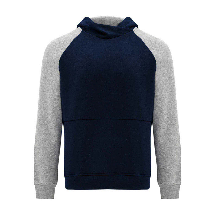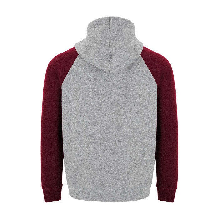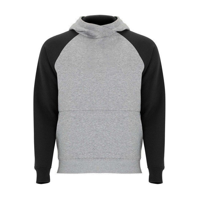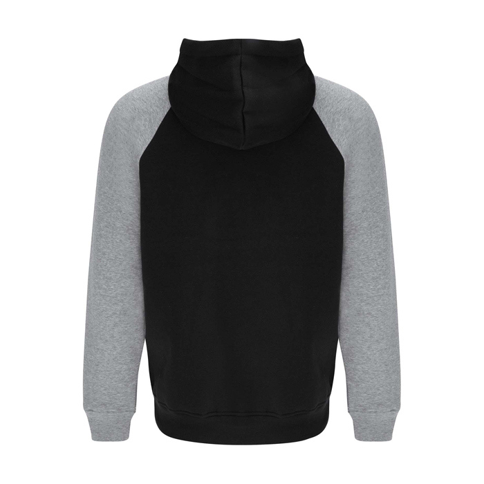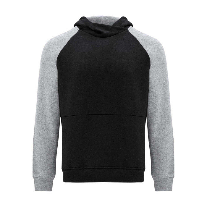 Felpa con cappuccio unisex bicolore. Cappuccio con collo incrociato e occhielli in metallo. Cappuccio interno a contrasto, cordoncino e maniche raglan. Tasca a canguro. Polsini e orlo in maglia a coste 1x1 in elastan. Etichetta rimovibile.