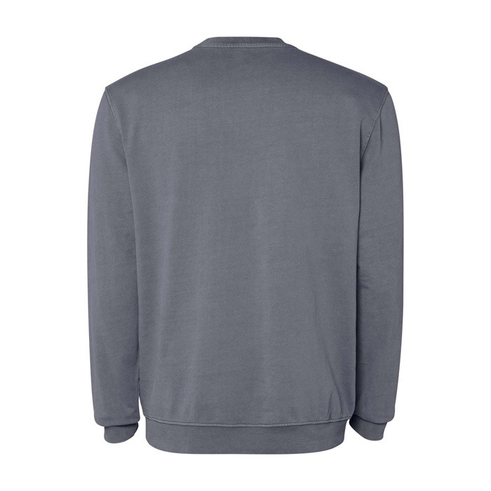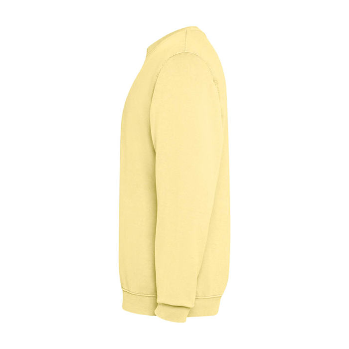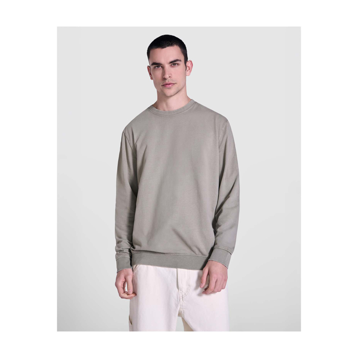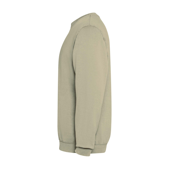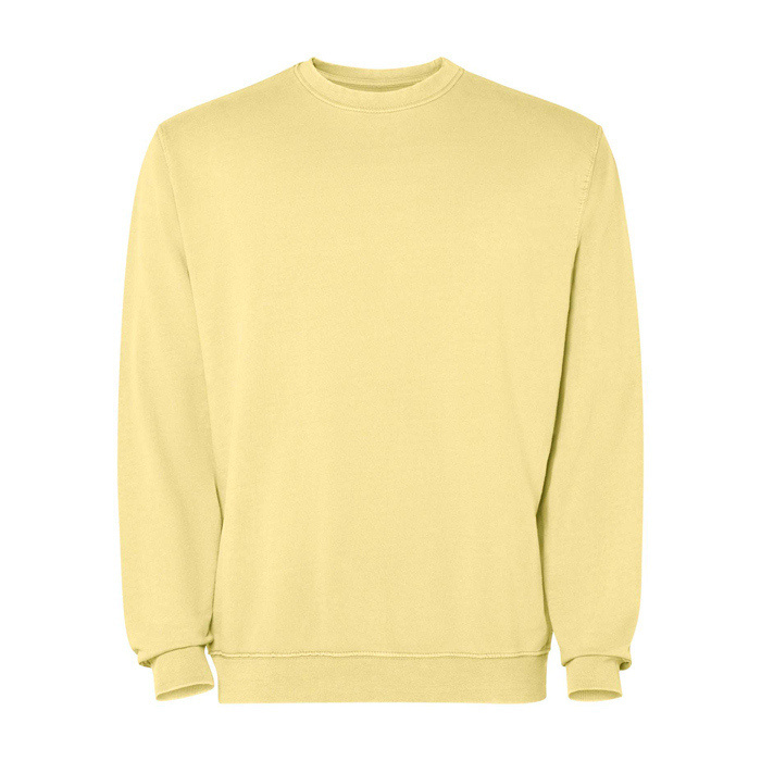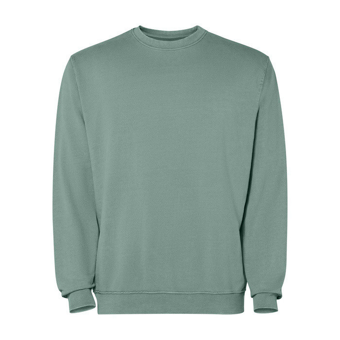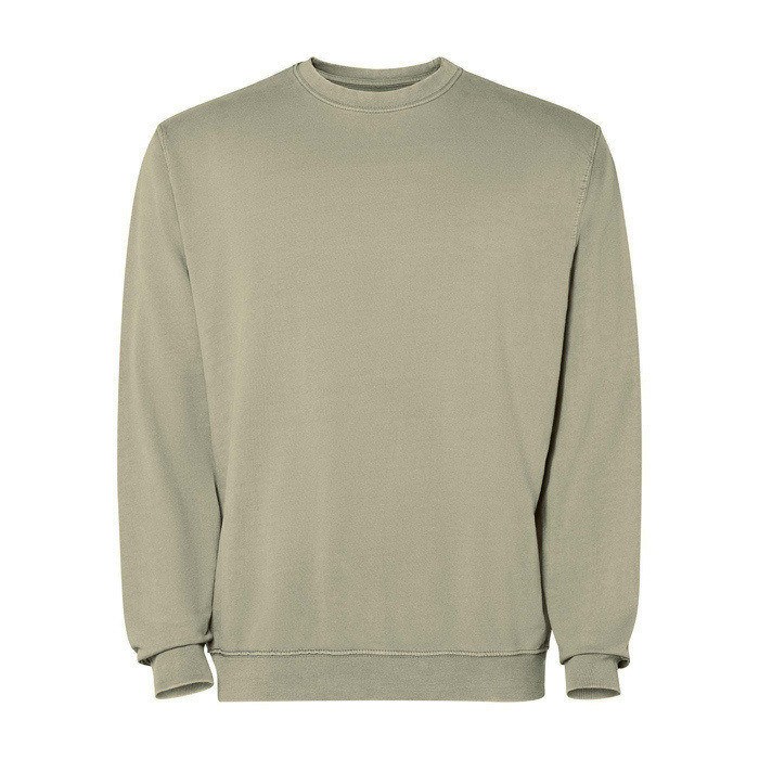 Maglione unisex con finitura con lavaggio acido. Colletto, polsini e orlo a costine 2x1 in tono. Cuciture rinforzate su polsini, orlo, vita e giromanica. Ccopertura tono su tono sulle cuciture sul collo.