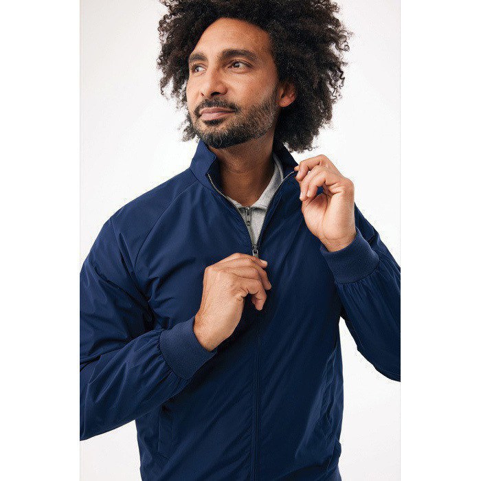 Giacca urbana unisex in poliestere 100% riciclato con membrana RTPU. Include una zip centrale senza nichel con tiretto metallico e cordino, oltre a due tasche laterali a filetto con chiusura a pressione nascosta. Collo, polsini e fondo hanno un bordo elastico per una sensazione morbida al tatto. Include una fodera con zip nascoste sul fondo e sul petto sinistro per facilitare la personalizzazione. Integra un codice QR per l’accesso al passaporto digitale, utile per iniziative HR o merchandising aziendale.