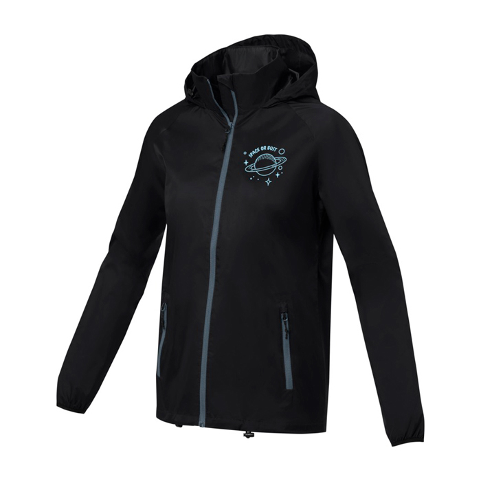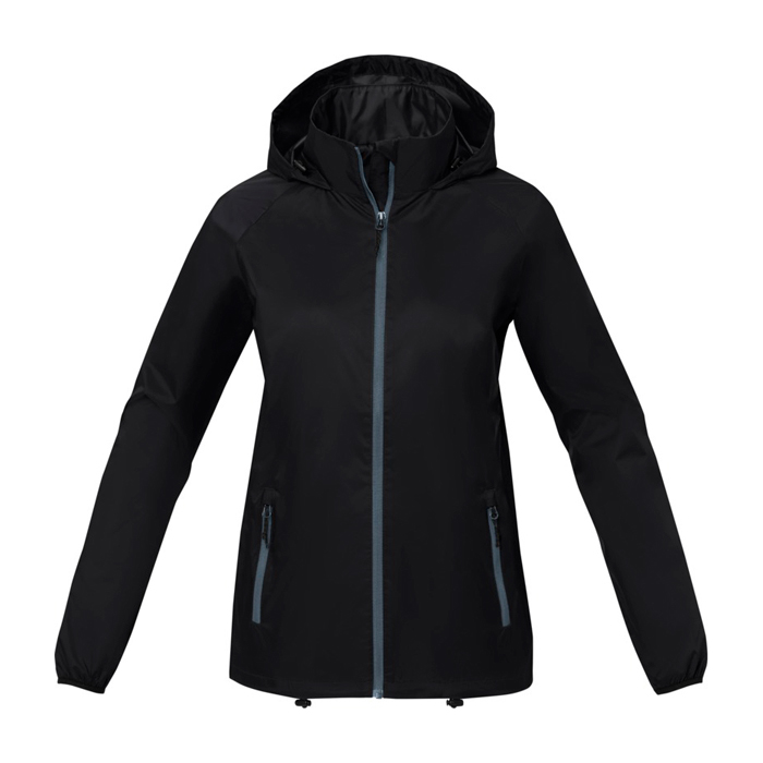 Giubbino leggero da donna con cappuccio ripiegabile. Impermeabilità 500 mm. Maniche raglan. Zip anteriore centrale reversibile a spirale. Tasche anteriori con zip. Tasca interna. Coulisse regolabile con cordino nell'orlo inferiore e nel cappuccio. L'etichetta principale è rimovibile per un maggiore comfort. Materiali: 280T ripstop 100% nylon, 72 g/m², fodera, 210T taffetà, 100% poliestere, 60 g/m².
