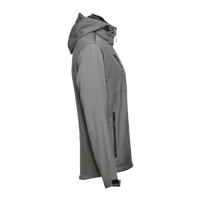 Giacca softshell, con cappuccio removibile. 96% poliestere e 4% elastan (2 strati): 280 g/m2. Rivestimento resistente all'acqua (classe III). Foderata con tessuto in pile. 2 tasche frontali con cerniera. Tasca diagonale sul petto, con cerniera. Polsini regolabili con striscia in velcro. Cappuccio removibile con cordoncino per regolare e nastro in velcro, per adattamento al collo. Zona inferiore della schiena con forma arrotondata. Semplice, di qualità e un capo perfetto per proteggere le tue squadre dal maltempo.