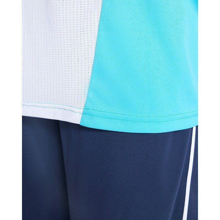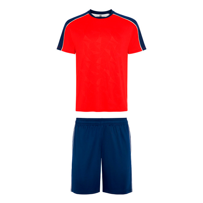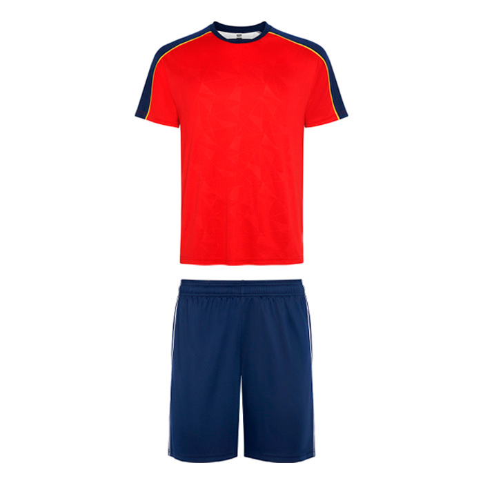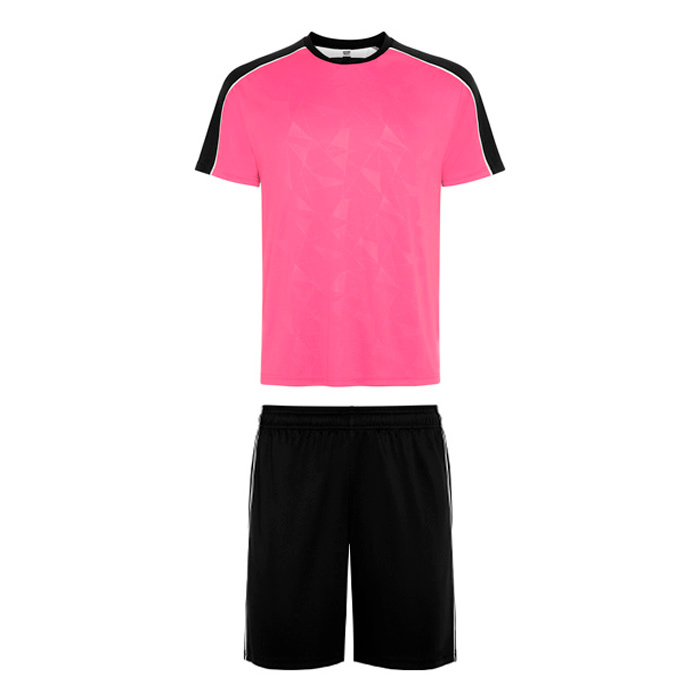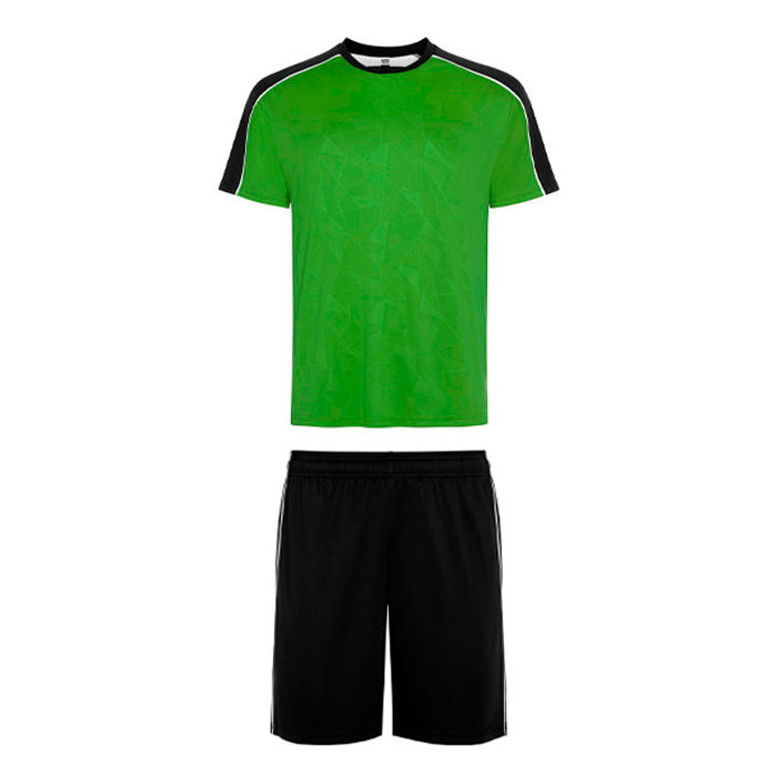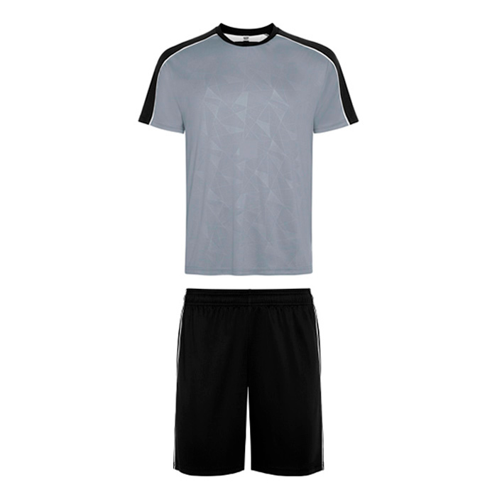 Completo sportivo in tessuto tecnico composto da maglietta a maniche corte e pantaloncini. Include una stampa sul davanti e profili a contrasto sulle cuciture per una finitura definita. Le maniche raglan facilitano il movimento durante allenamenti e attività di squadra. Sul retro incorpora un pannello centrale in tessuto mesh, libero per rilavorazioni e pensato per aggiungere ulteriori marcature. I pantaloncini combinano il tessuto principale con bande laterali traspiranti. Consigliato per divise per eventi, tornei interni o attività di branding.