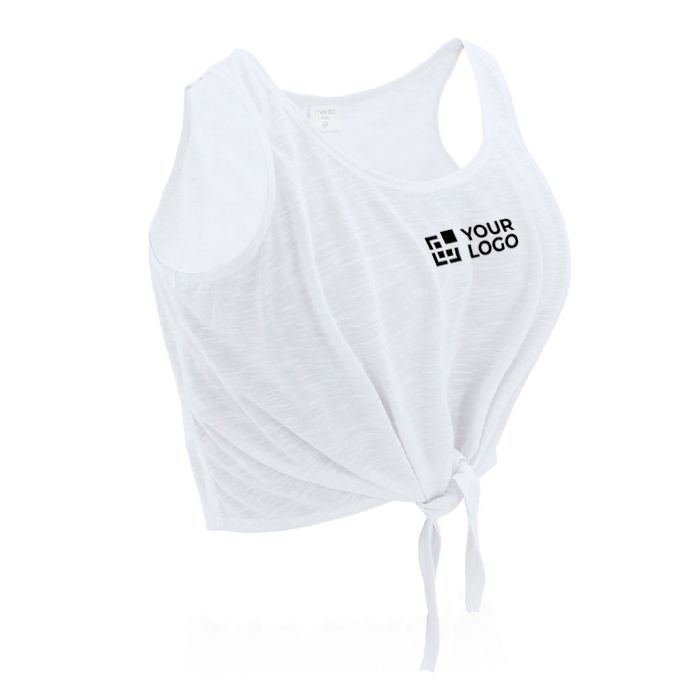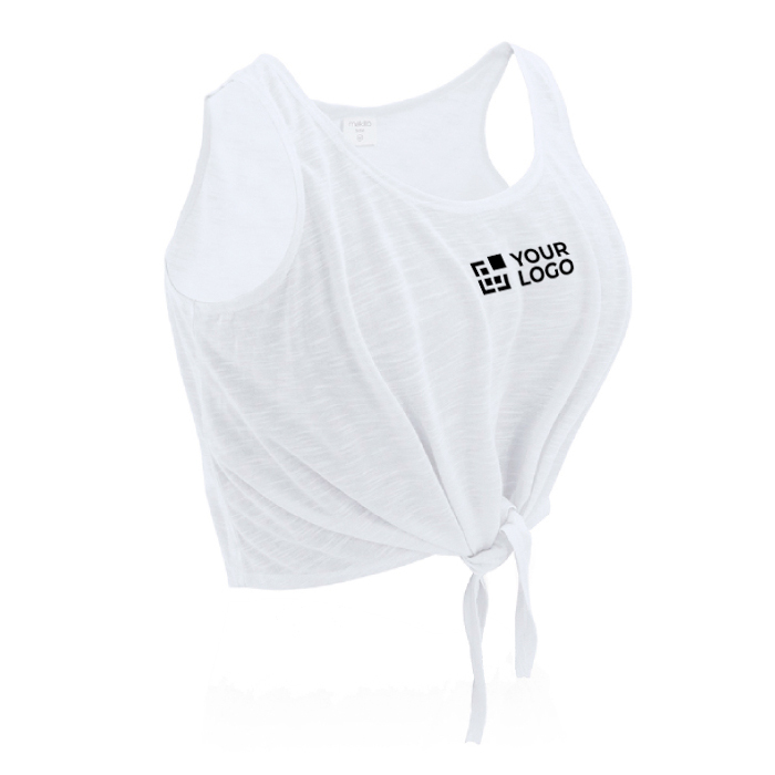Maglietta smanicata da donna in morbido poliestere 130 g/m², con due lacci sul davanti per fare un nodo. Disponibile in un'ampia gamma di brillanti colori fluorescenti. Taglie disponibili: S, M, L. La stampa in sublimazione è disponibile solamente per la maglia bianca.