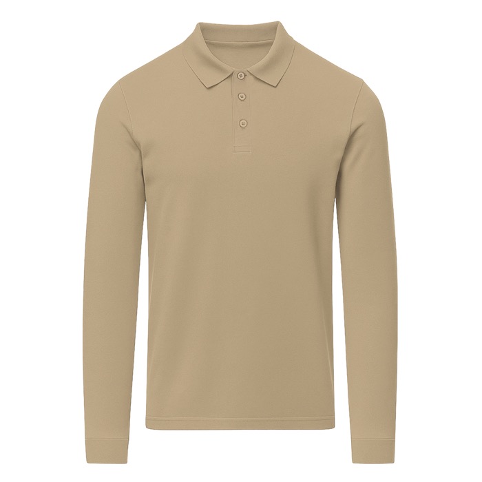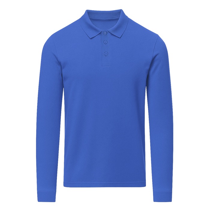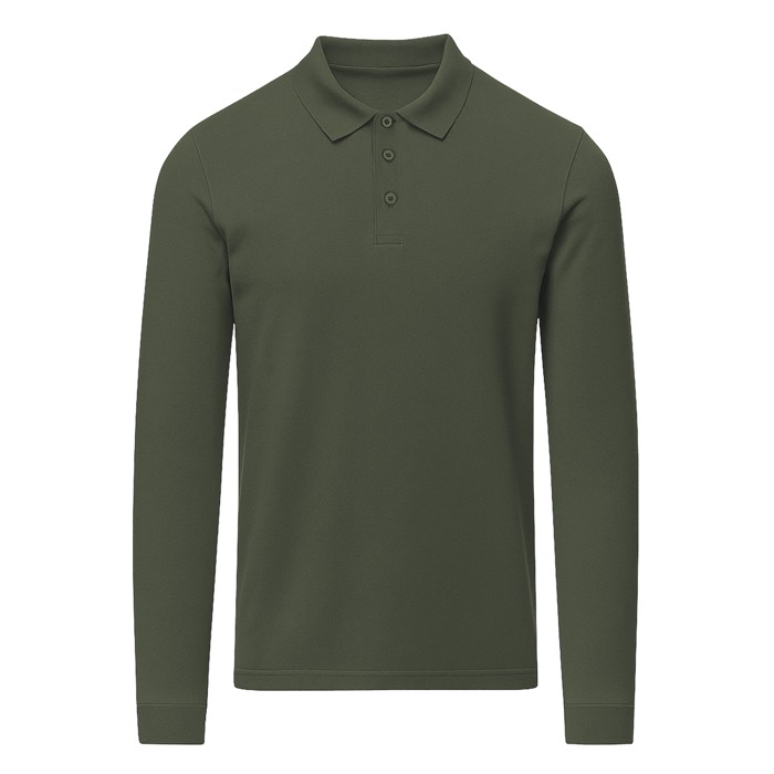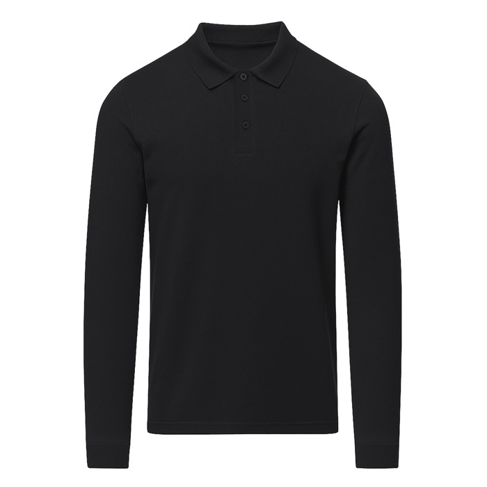 Polo unisex a maniche lunghe realizzata in tessuto piqué. Colletto e polsini in maglia a coste 1x1 con elastan per una migliore vestibilità e comfort. Pattina a tre bottoni tono su tono e nastro di rinforzo sul collo.