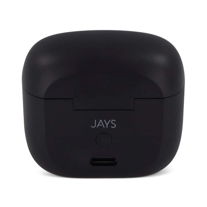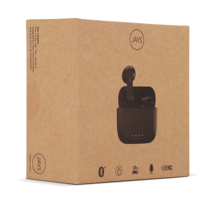 Auricolari wireless ergonomici della Jays in ABS, che offrono una qualità di chiamata superiore e una vestibilità perfetta grazie ai 3 diversi gommini in silicone. È dotato di un microfono di qualità superiore per conversazioni chiare. Batteria agli ioni di litio. Spia luminosa con LED. Ha un'autonomia di circa 4 ore con una sola carica e tre cariche aggiuntive nella custodia di ricarica. Compatibile con qualsiasi dispositivo dotato di Bluetooth.