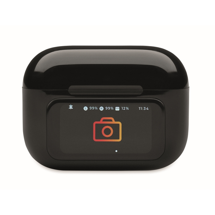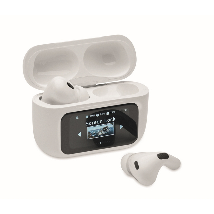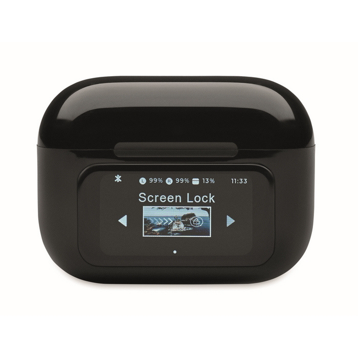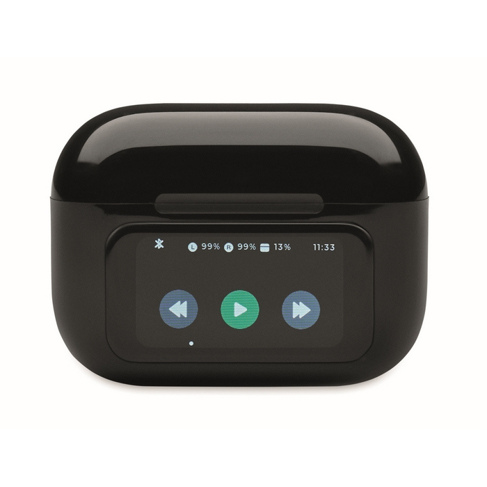 Auricolari wireless TWS con schermo touch e base di ricarica da 230mAh, un accessorio pubblicitario innovativo che rafforza la tua immagine tecnologica.