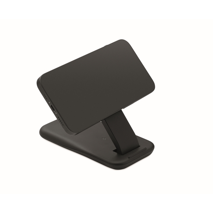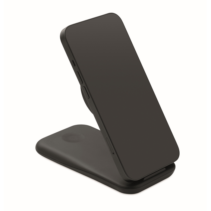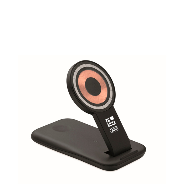 Per consolidare l'immagine del tuo brand nel settore tecnologico, proponi una base di ricarica 3 in 1 con supporto per cellulare, compatibile Apple®. Questo gadget integra un caricatore wireless per telefono, uno per smartwatch e un comodo stand, organizzando i dispositivi in un unico punto. La tua azienda si posizionerà come un partner affidabile per soluzioni tech avanzate. È un modo per essere presente nella routine quotidiana dei tuoi clienti, associando il tuo brand a innovazione, efficienza e un'esperienza digitale senza interruzioni.