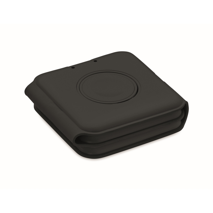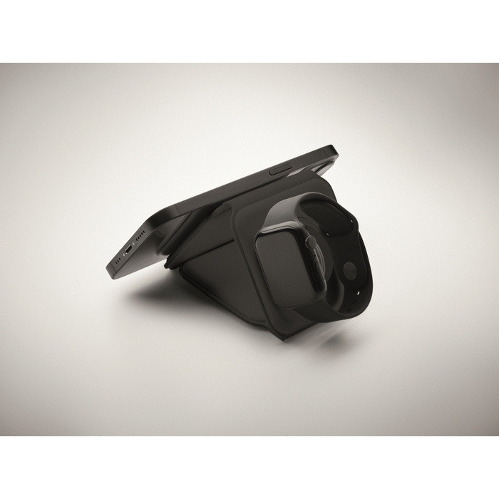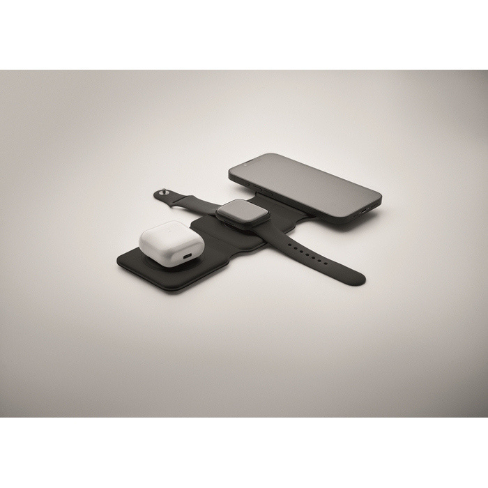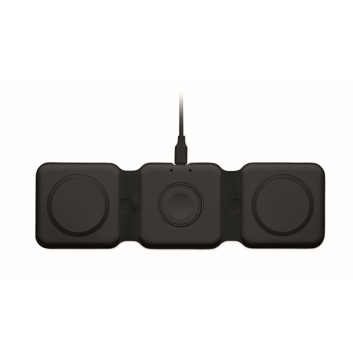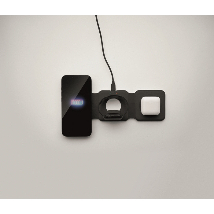 Base di ricarica pieghevole 3 in 1 realizzata in ABS con 3 punti di ricarica wireless. Ingresso: 2-in-1 di tipo-C e Tipo-A. Compatibile con gli ultimi Android, iPhone® 8, X e più recenti. Compatibile anche con iWatch.