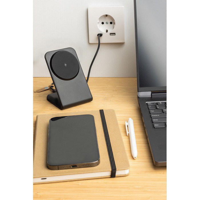 Supporto magnetico per ricarica wireless da 15W che garantisce una ricarica rapida e sicura grazie alla potenza di uscita di 15W e al fissaggio magnetico con 15 magneti di alta qualità, che assicurano l’allineamento del dispositivo sia in posizione verticale che orizzontale. La base è dotata di pad in silicone che garantiscono stabilità su qualsiasi superficie, oltre a un indicatore di carica integrato. Realizzato in plastica ABS riciclata con certificazione RCS (47% di contenuto riciclato sul peso totale dell’articolo). Senza PVC e confezionato in scatola kraft con certificazione FSC. Include cavo USB-C a USB-C da 120 cm in TPE riciclato con certificazione RCS. Ingresso USB-C: 9V/2,22A.