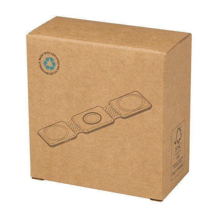 Caricatore wireless 3 in 1 in plastica riciclata, progettato per ricaricare contemporaneamente smartphone, auricolari tipo AirPods e smartwatch tipo iWatch. Offre ricarica wireless fino a 15W e un design pieghevole con chiusura magnetica che ne facilita il trasporto e mantiene il telefono stabile durante l’uso. Consente di posizionare il telefono in orizzontale mentre si ricarica, utile per videochiamate o per la visione di contenuti. Compatibile con telefoni dotati di ricarica wireless, incluso iPhone 12 e successivi (o smartphone con anello magnetico). Include connettore tipo-C (USB-C). Ottima soluzione per attività di branding in fiera o come omaggio per team commerciali.
