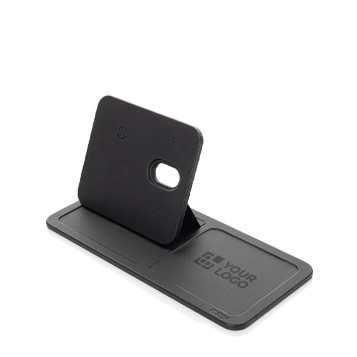 Lussuoso caricatore wireless pieghevole 3 in 1 e vassoio da tavolo in PU riciclato RCS.Contenuto totale riciclato: 5% in base al peso totale dell'articolo. La certificazione RCS garantisce una catena di approvvigionamento dei materiali riciclati completamente certificata. E' dotato di un caricatore wireless magnetico da 15W e di un caricatore wireless aggiuntivo da 5W adatto alle custodie degli auricolari o ad altri piccoli dispositivi ricaricabili senza fili e di un caricatore wireless da 2,5W per gli smartwatch (solo per gli orologi Apple). Incluso cavo TPE da 120 cm. Confezionato in scatola FSC® mix. Articolo e accessori 100% privi di PVC. Input minimo: 9V/3A per un utilizzo ottimale. Output: Telefono: 9V/1.1A; 9V/1.67 A/(15W), Auricolari: 5V/1A (5W), Orologio: 5V/0,5A.
