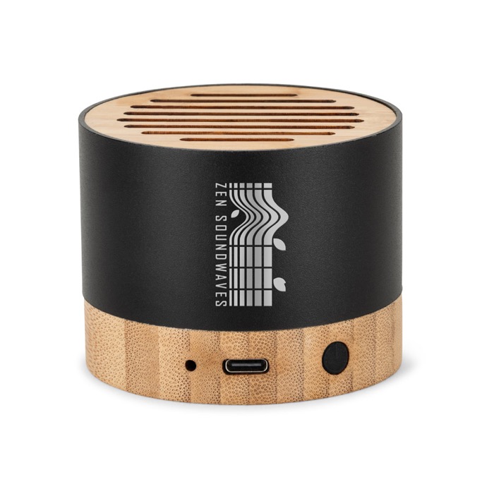Altoparlante portatile in alluminio riciclato e bambù, pensato per un utilizzo quotidiano semplice in ufficio o in movimento. Integra microfono e funzione vivavoce per rispondere alle chiamate e controllare la riproduzione senza toccare il telefono. Connessione wireless Bluetooth v5.3 e potenza sonora da 3 W per spazi piccoli. Batteria da 300mAh con fino a 3 ore di utilizzo e ricarica in circa 2 ore tramite USB-C. Include cavo USB-A/USB-C e confezione regalo in carta kraft, ideale per pack aziendali e iniziative di brand.