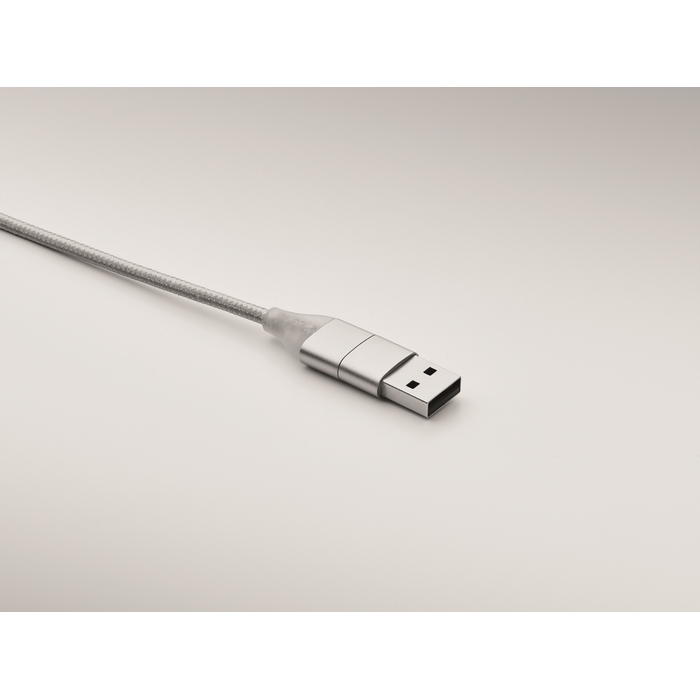 Cavetto di ricarica in alluminio con ingresso 2 in 1 di tipo C e tipo-A e micro B (presa 2 in 1), uscita tipo C e micro B. Lunghezza del cavetto: 120 cm.