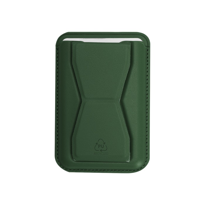 Portacarte supporto in pelle sintetica riciclata dal design sobrio, ideale per l’uso quotidiano in ufficio o in mobilità. Integra un supporto multifunzione che consente di posizionare lo smartphone in diverse angolazioni, facilitando videochiamate, lettura o lavoro a mani libere. Il sistema di fissaggio magnetico aiuta a mantenerlo saldo e a portata di mano, mentre il distintivo del materiale riciclato aggiunge un dettaglio informativo discreto. Una scelta pratica per attività di branding in fiere, onboarding o merchandising aziendale.
