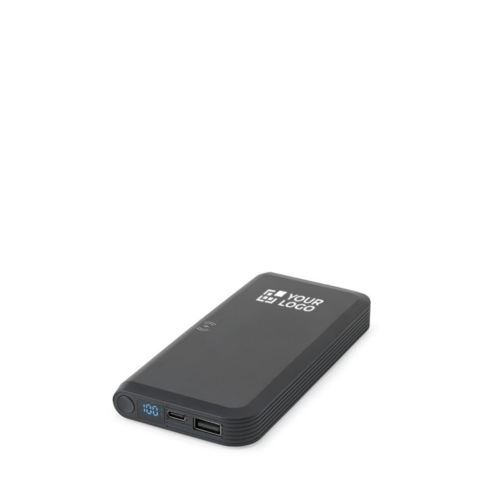 Power bank da 10.000 mAh in ABS riciclato 100% rABS, con ricarica wireless da 15 W, display LED, ingresso USB-C PD da 20 W e uscite USB-C PD da 20 W e USB-A QC da 18 W. Include cavo USB-C con adattatore USB-A/USB-C. Confezionato in scatola regalo kraft riciclata.