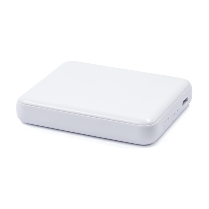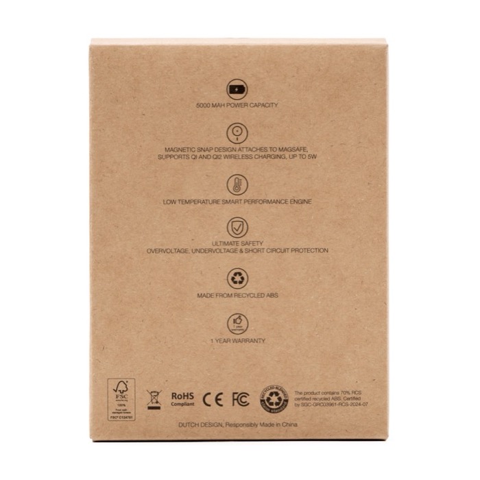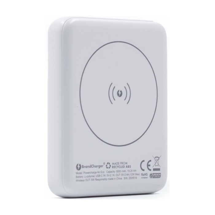 Batteria esterna magnetica wireless in plastica riciclata, pensata per essere portata in tasca e ricaricare lo smartphone senza complicazioni. Offre 5000mAh di capacità e supporta la ricarica wireless magnetica da 5W compatibile con MagSafe, Qi1 e Qi2, oltre alla ricarica via cavo tramite porta USB-C con uscita da 12W. Include un indicatore LED e un chip di sicurezza intelligente contro sovracorrente, sovraccarico, surriscaldamento e cortocircuito. Un'opzione pratica per il merchandising tecnologico in eventi, team commerciali o iniziative di fidelizzazione.