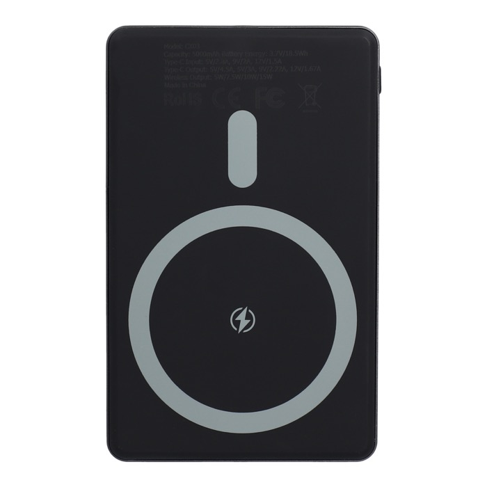 Power bank con MagSafe 5000 mAh, ricarica wireless 15 W e ingresso/uscita Type-C. Ultra sottile (9.22 mm), leggera (112 g), ricarica in 2-3 ore. Realizzato in ABS riciclato, con cavo USB-C da 22 cm incluso.