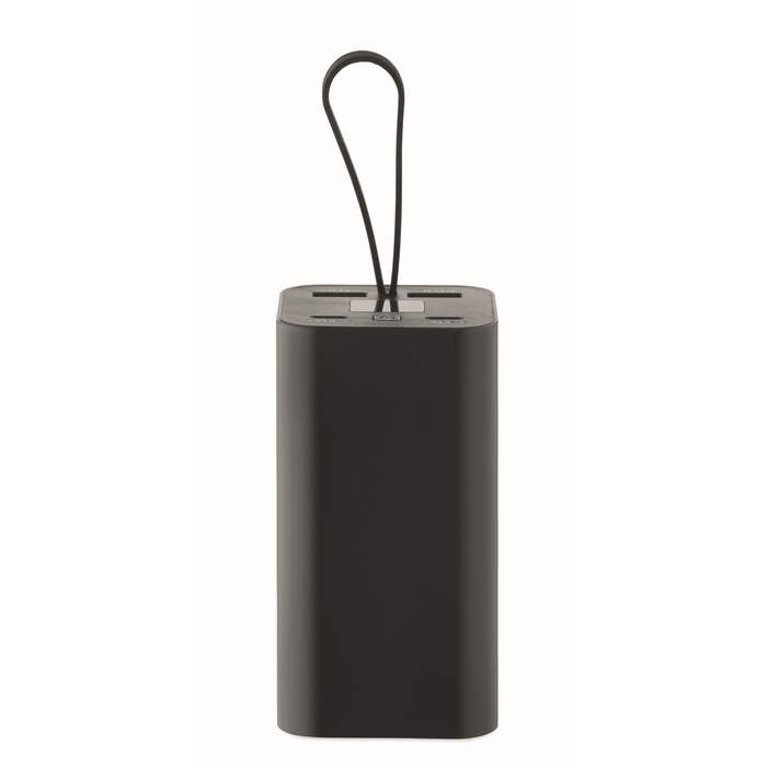 Power bank in alluminio riciclato con schermo digitale per controllare a colpo d’occhio il livello di carica e gancio in silicone per portarlo nello zaino o appenderlo a una valigetta. Integra due uscite USB-C e due USB-A per caricare più dispositivi contemporaneamente. Include la ricarica rapida PD da 65 W, utile per smartphone, tablet e dispositivi compatibili. Consigliato per kit di benvenuto, eventi e team commerciali in mobilità.
