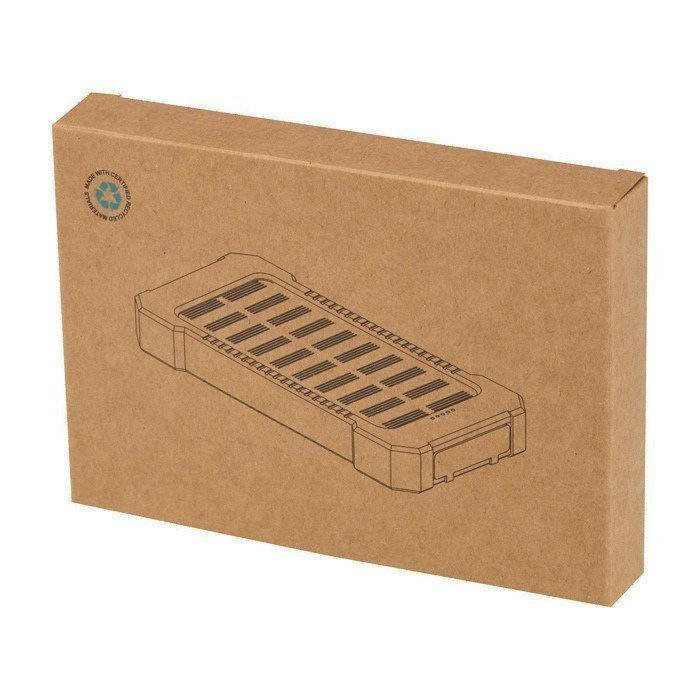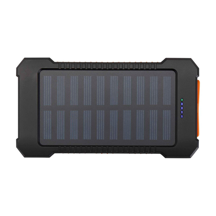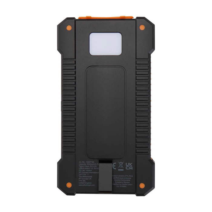 Il power bank a energia solare da 5000 mAh, realizzato in plastica riciclata, è progettato per durare nel tempo e per essere pratico. Offre due porte di uscita USB-A e una porta di ingresso/uscita di Tipo-C per opzioni di ricarica flessibili. Progettato con un esterno robusto, presenta una clip rimovibile per un agganciarlo in modo semplice, una torcia incorporata e di connettori custoditi in modo sicuro dietro un tappo in silicone. Grazie alla capacità di ricarica solare e all'indicatore LED che mostra lo stato della carica, questo power bank è l'accessorio ideale per le avventure all'aperto.