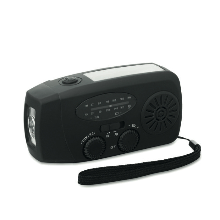 Connettività e ricarica in situazioni impreviste con questo dispositivo multifunzione. Include radio AM/FM, torcia LED regolabile e powerbank solare o dinamo.