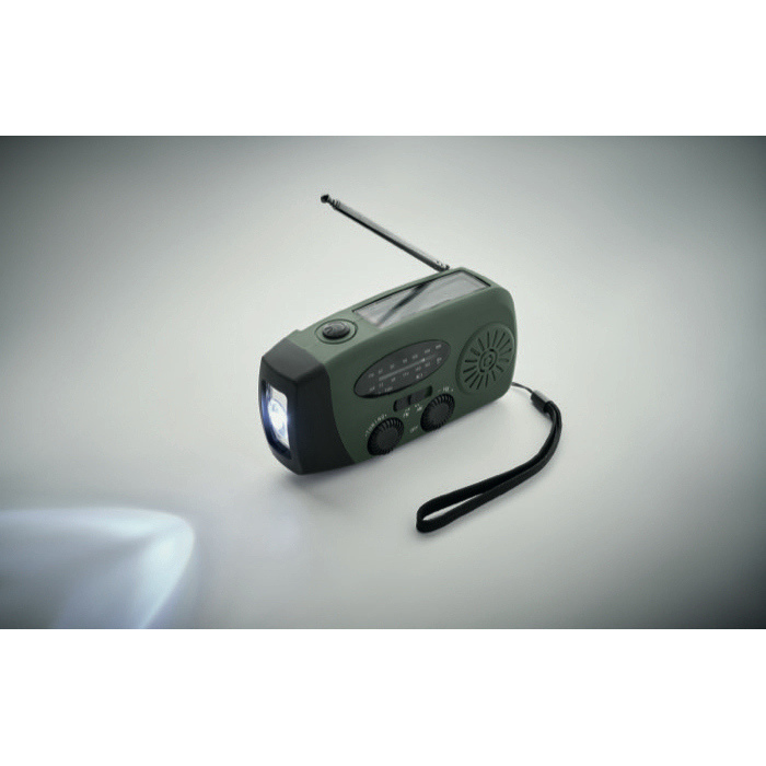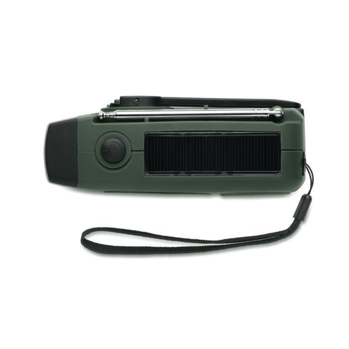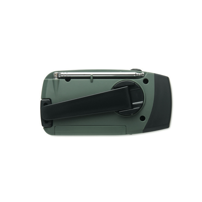 Radio portatile AM/FM in ABS con torcia a LED (2 impostazioni) e un powerbank da 1200 mAh per la ricarica di emergenza. Autoalimentata con energia solare e manovella.