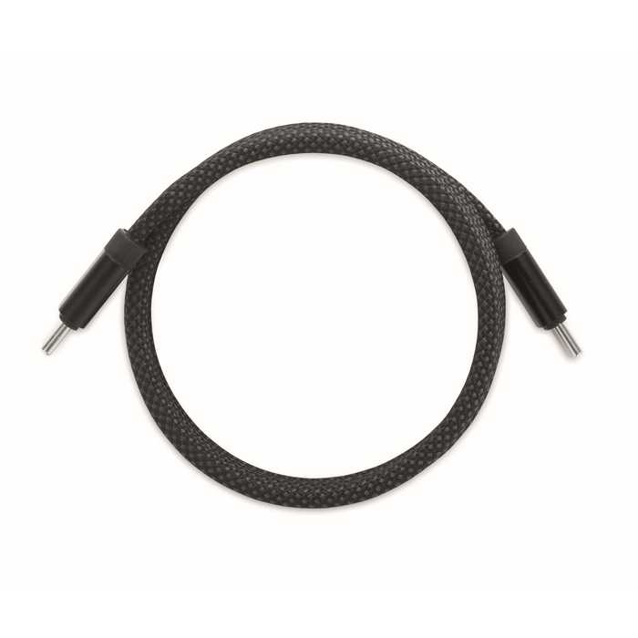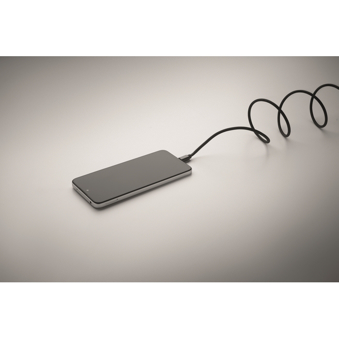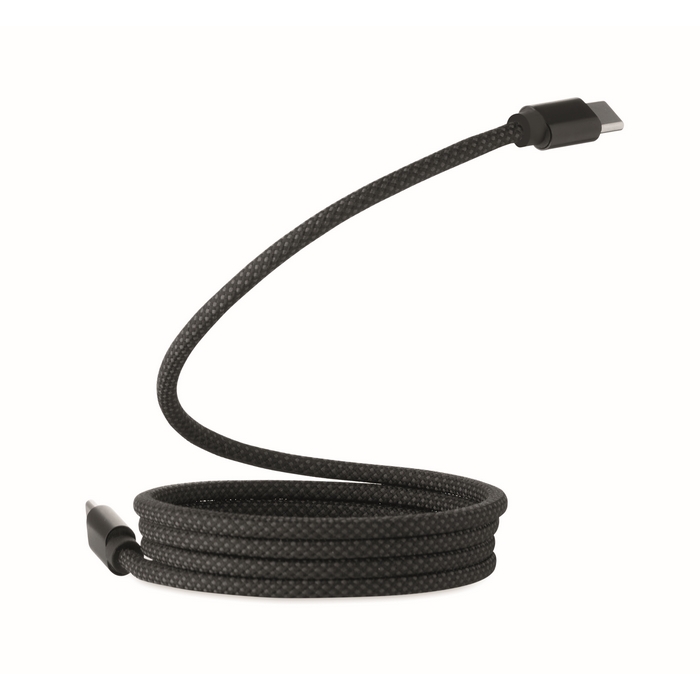 Cavo magnetico intrecciato realizzato in RPET e alluminio, pensato per l’uso quotidiano in ambienti d’ufficio. Con connessione Tipo C a C, consente la ricarica rapida fino a 60 W e offre 1 metro di lunghezza per lavorare comodamente alla scrivania, in sale riunioni o in postazioni flessibili. Il design magnetico aiuta a impilarlo in modo ordinato ed evita che si annodi, facilitando lo stoccaggio e il trasporto. Opzione pratica per welcome kit, eventi o materiale aziendale.