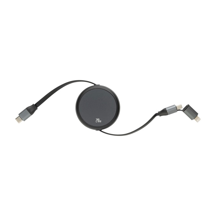 Cavo retrattile in alluminio riciclato con componenti in plastica e gomma, pensato per la ricarica rapida e l’uso quotidiano in mobilità. Integra un ingresso USB-C e una doppia uscita USB-C e iOS, per coprire dal telefono al portatile con potenza fino a 240W. Il meccanismo retrattile si estende da un solo lato e consente di scegliere tra quattro lunghezze per mantenere più ordinati la scrivania o l’auto. Offre sincronizzazione dati a 480Mbps e compatibilità con CarPlay e Android Auto. Consigliato per iniziative di marketing e dotazioni aziendali.
