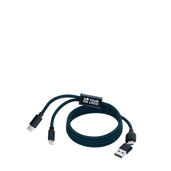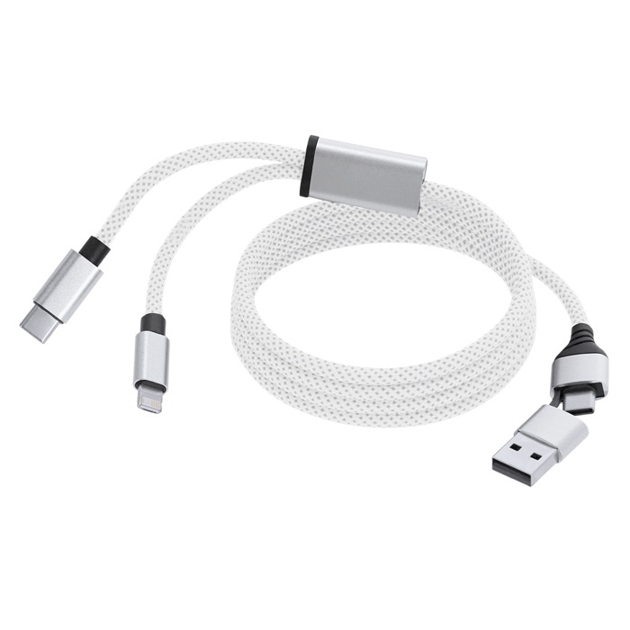 Cavo di ricarica con design magnetico per evitare grovigli, realizzato in resistente alluminio. Con doppia connessione di ingresso (Tipo C/USB) e uscite Tipo C e 2 in 1 (Lightning e Micro USB).