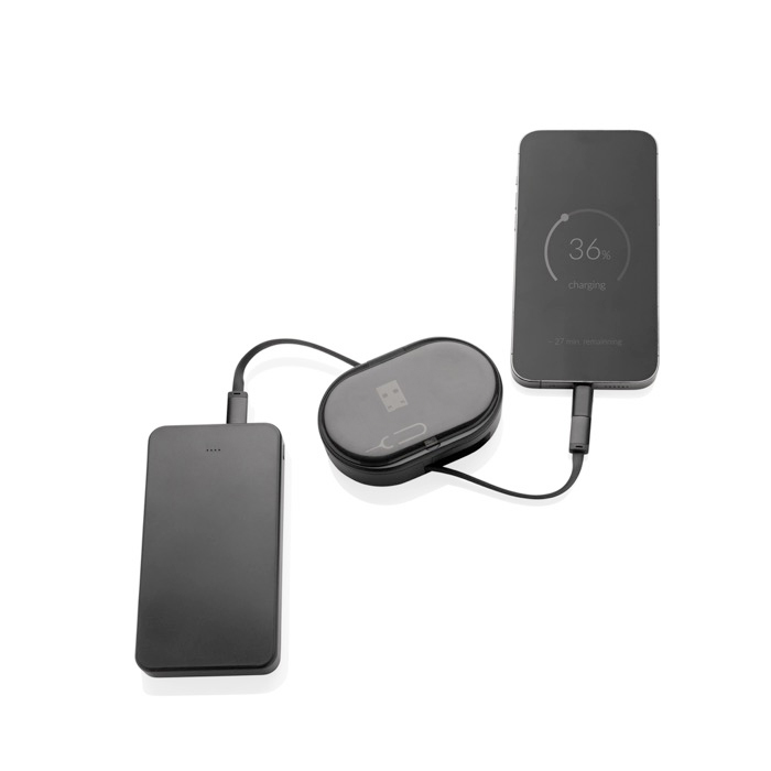 Kit di cavi di ricarica retrattili in materiali riciclati con certificazione RCS (Recycled Claim Standard), pensato per tenere tutto in ordine in un formato compatto. Integra un cavo retrattile da 80 cm con connettori USB-C, USB-A, Micro e Lightning per ricarica e trasferimento dati. Compatibile con CarPlay e Android Auto, facilita la connessione in mobilità. Offre fino a 60W in USB-C a USB-C e 12W in altre combinazioni. Include supporto per telefono, pin per l’estrazione della SIM e slot per schede. Risorsa pratica per fiere, team commerciali o merchandising tecnologico.