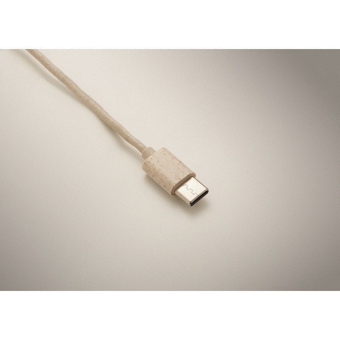 Set di cavi in custodia in paglia di grano/ABS con coperchio in bambù e moschettone, pensato per essere trasportato in zaino, borsa o valigetta senza grovigli. Il coperchio si trasforma in supporto per lo smartphone in posizione orizzontale, utile per le videochiamate o sulla scrivania. Include ingresso cavo 2 in 1 USB-C/A e uscite Type-C e 2 in 1 pin per coprire diversi dispositivi con un unico accessorio. Consigliato per welcome pack ed eventi aziendali.