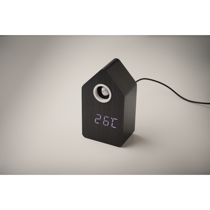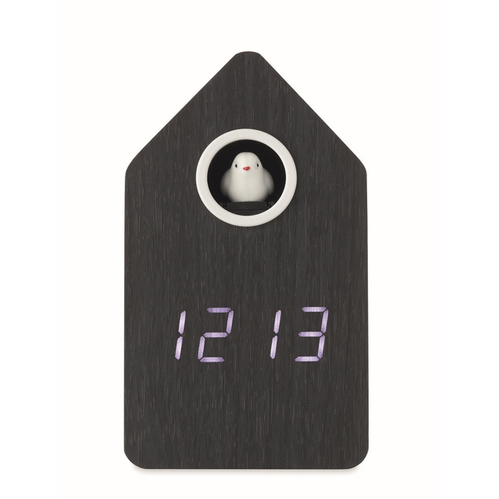 Orologio a cucù in MDF con allarme incorporato / indicatore di temperatura. L’uccellino esce ogni ora e ha voce di cucù. Display LED bianco. Il suono si disattiva automaticamente tra le 22:00 e le 06:00. Intervalli di ripetizione di 5 minuti.