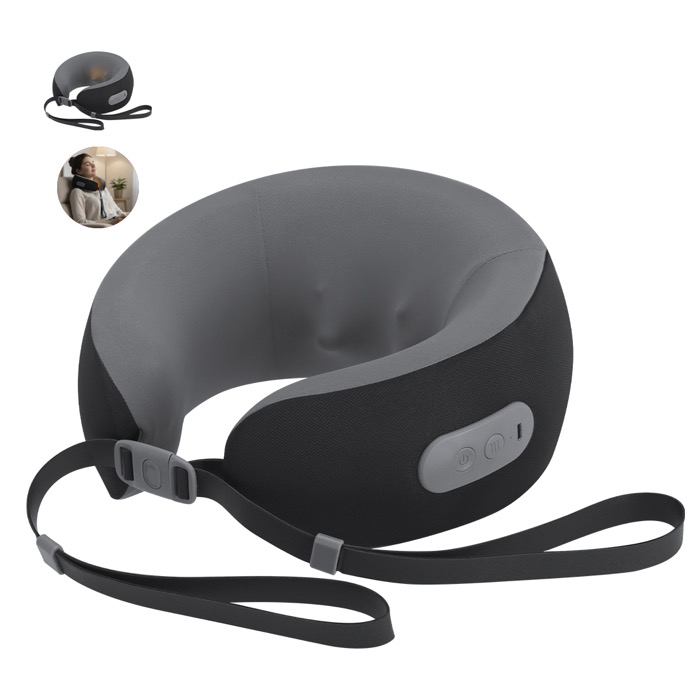 Cuscino massaggiante per il collo con fodera in poliestere, perfetto per viaggi e lunghe giornate. Include chiusure con fibbia per una regolazione rapida e comoda. Il controllo si gestisce tramite un pulsante ON/OFF/SWITCH (accensione/spegnimento/cambio) con indicatore luminoso per vedere lo stato di utilizzo. Integra una batteria ricaricabile da 1.200 mAh e ingresso USB-C (Universal Serial Bus Tipo C) per una ricarica semplice. Utile come omaggio aziendale per iniziative di benessere, viaggi d’affari o eventi.
