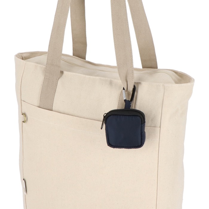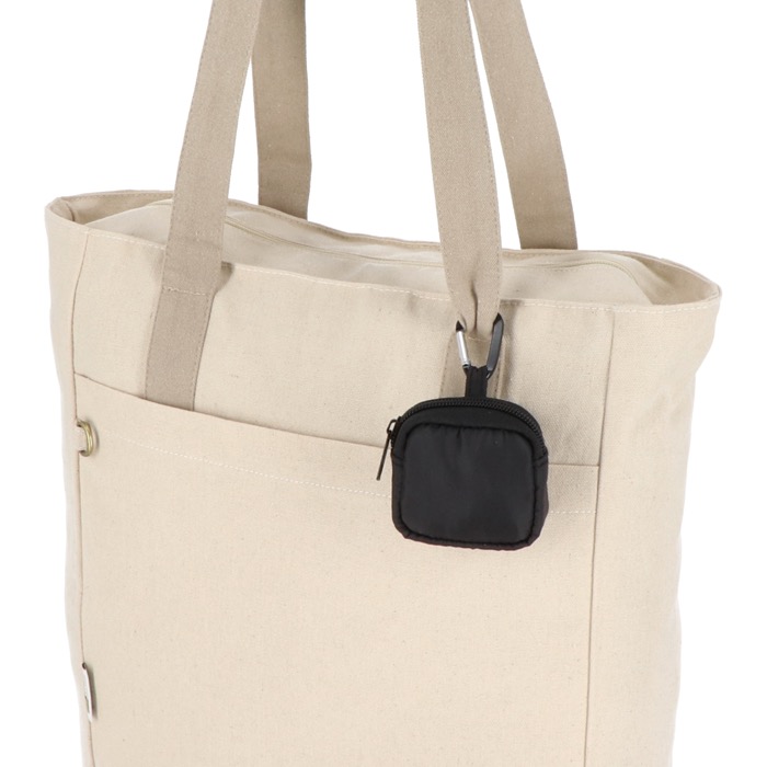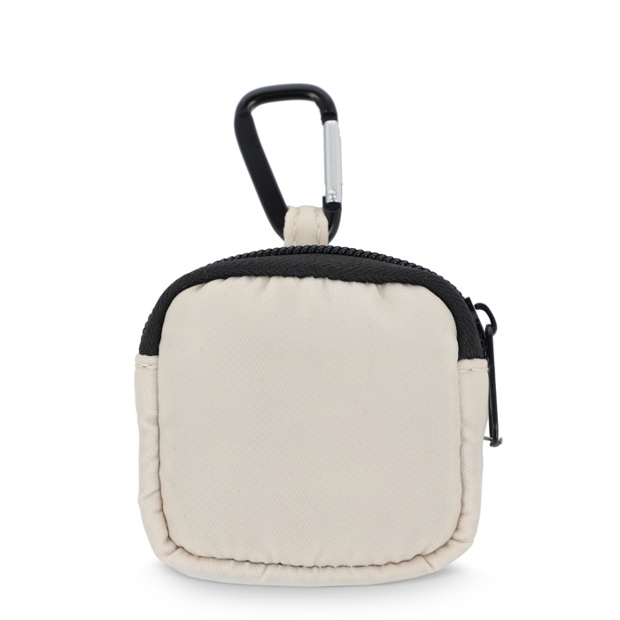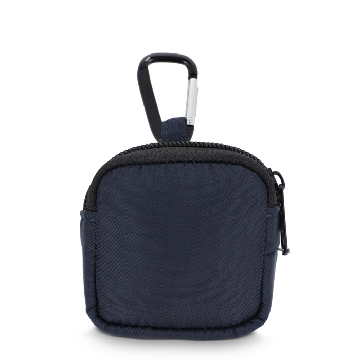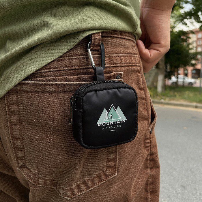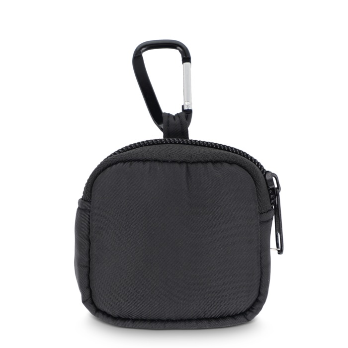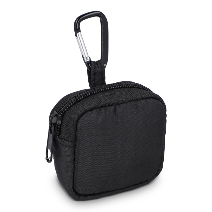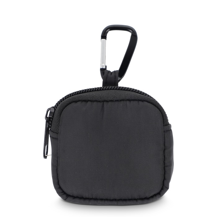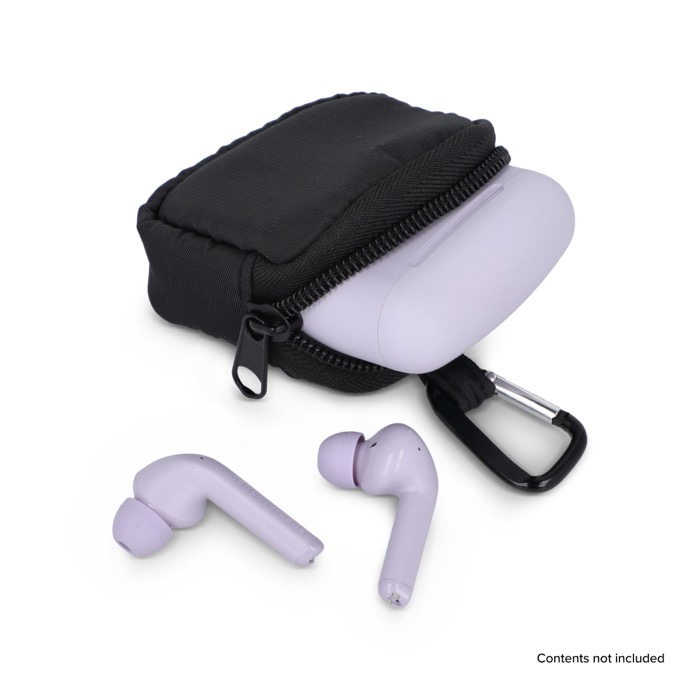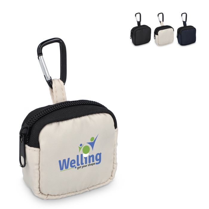 Custodia compatta con zip e moschettone per portare auricolari e piccoli oggetti sempre a portata di mano. Il tuo brand si integra in eventi, viaggi e routine quotidiana.