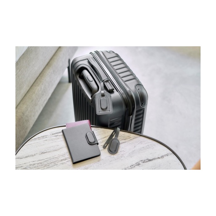 "Etichetta in PU riciclato con cinturino per un fissaggio sicuro ai propri effetti personali. Integra un tracker Apple FindMy e dispone di uno spazio interno per un inserto con informazioni personali. Utilizza ""Impression"" come nome del dispositivo e riporta il logo Impression per la registrazione dell'ID. Confezionata singolarmente in una scatola di carta kraft."