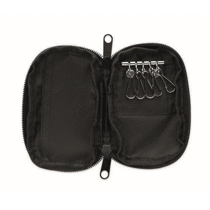 Astuccio portachiavi in RPET 300D con fodera interna in RPET 210D, pensato per organizzare e trasportare le chiavi in modo ordinato. Integra una chiusura a zip per mantenere il contenuto protetto in borse, zaini o cassetti. Include 5 rondelle metalliche per separare i mazzi di chiavi per accesso, reparto o veicolo, facilitando la gestione quotidiana. Formato compatto e facile da maneggiare in reception, manutenzione o team commerciali. Adatto come articolo corporate per fiere, onboarding o kit di lavoro.