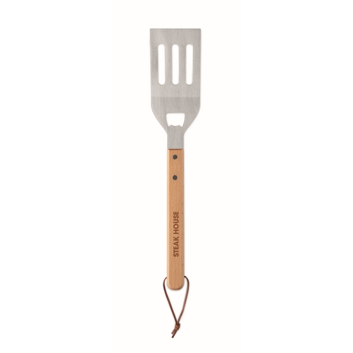 Spatola per barbecue in acciaio inox con manico in legno di faggio, pensata per maneggiare carne e verdure sulla griglia con una presa comoda. Include un apribottiglie integrato per averlo a portata di mano durante il servizio. Il cordino di sospensione in PU consente di riporla appesa e mantenere in ordine l’area cucina. Un’opzione pratica per attrezzare azioni di hospitality, kit da cucina o regali aziendali legati a eventi gastronomici.