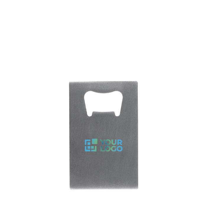 Sottile apribottiglie a forma di carta di credito con ampio spazio per il marchio. Facile da trasportare, è un utile oggetto promozionale che consente di tenere il tuo marchio a portata di mano.
