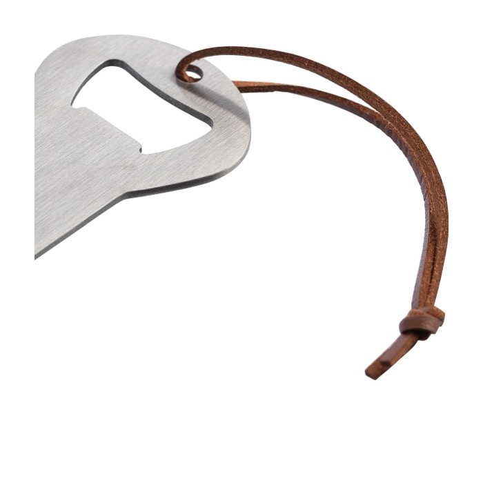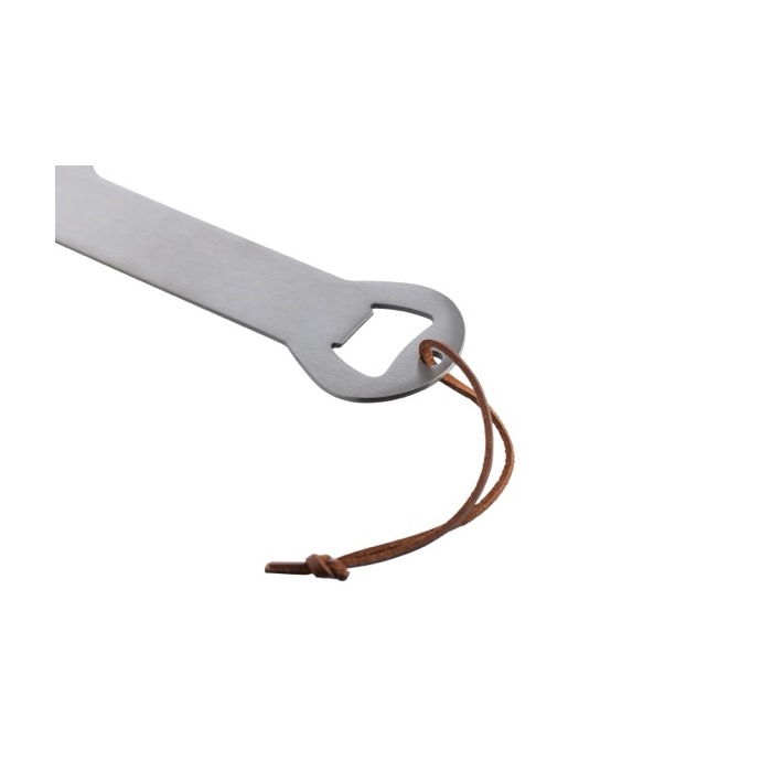 Pulitore per barbecue in acciaio inox con apribottiglie integrato. Dotato di cordino in PU per una comoda sospensione e facile conservazione. Confezionato singolarmente in una custodia di carta kraft.