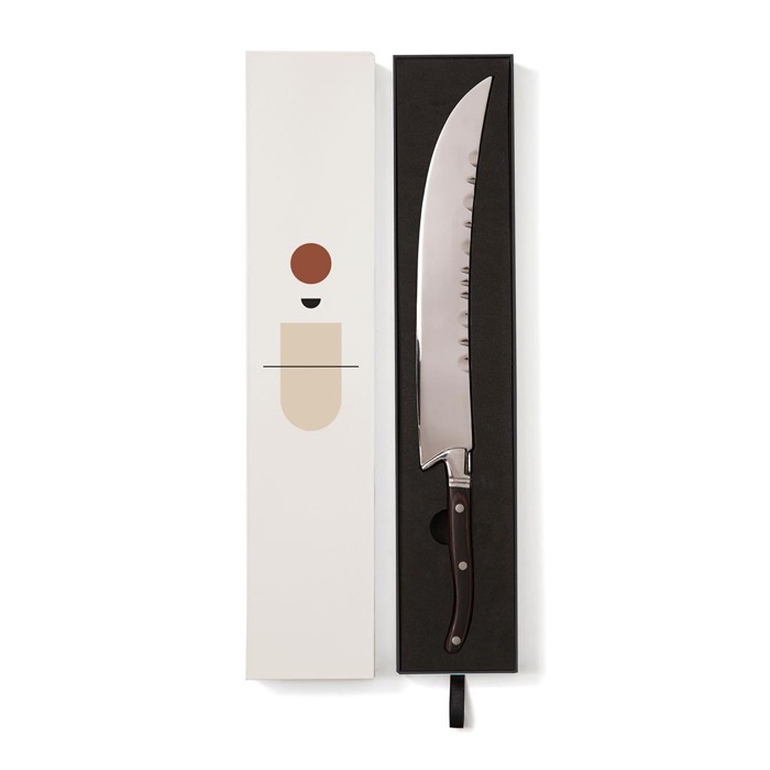 4. Affettatore o coltello da prosciutto: progettato per tagli sottili e lunghi di carni cotte, prosciutti o salumi. Ha una lama lunga, sottile e flessibile per garantire tagli precisi.