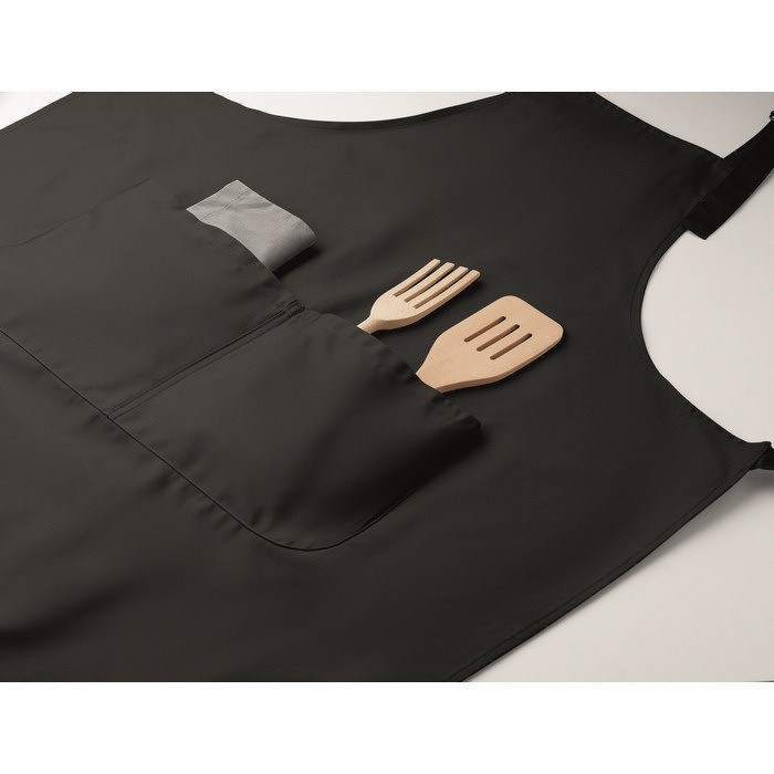 Grembiule da cucina lungo in policotone da 240 g/m² (35% cotone, 65% poliestere), pensato per un uso quotidiano comodo e ordinato. Include due tasche anteriori per tenere a portata di mano utensili, un blocco note o strofinacci. La cinghia del collo è regolabile e si fissa con una fibbia metallica, facilitando la regolazione a diverse altezze. Il tessuto offre un buon equilibrio tra resistenza e facilità di manutenzione. Adatto per uniformare team nella ristorazione, eventi culinari o attività di branding.