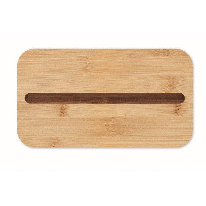 Porta pranzo realizzato in PP riciclato e coperchio in bambù con funzione di supporto per telefono. Ha due vaschette da 400 ml ciascuna, per un totale di 800ml, ed un divisorio rimovibile. Sotto il coperchio ha un cassettino per le posate che sono incluse. Fascia elastica in poliestere per una migliore chiusura. Il bambù è un materiale naturale, per cui il colore del coperchio potrebbe variare leggermente tra un contenitore e l'altro.
