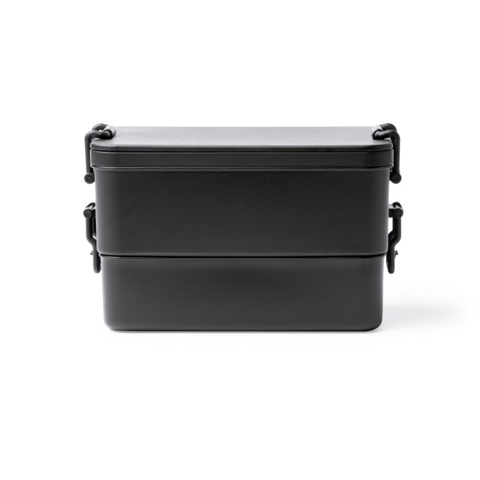 Portapranzo in plastica con sistema a doppio scomparto per separare gli alimenti senza mescolarli. I due contenitori, di dimensioni diverse, possono essere impilati uno sull’altro o riposti uno dentro l’altro per occupare meno spazio. Ogni scomparto include una chiusura di sicurezza con fibbie laterali, pensata per il trasporto quotidiano. Il coperchio integra un set di posate fissato con un supporto a clip, per mangiare senza dipendere dall’ufficio o dall’evento. Una soluzione pratica per iniziative interne, formazioni o regali con logo.