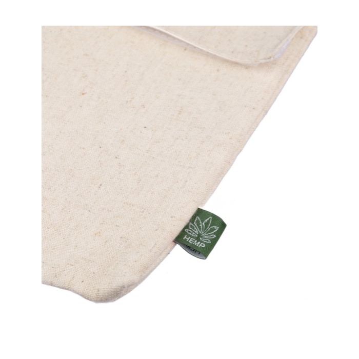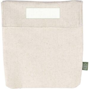 Sacchetto termico in canapa da 170 g/m², con fodera in PEVA e chiusura in velcro. Presenta una piccola etichetta laterale con il logo della canapa.