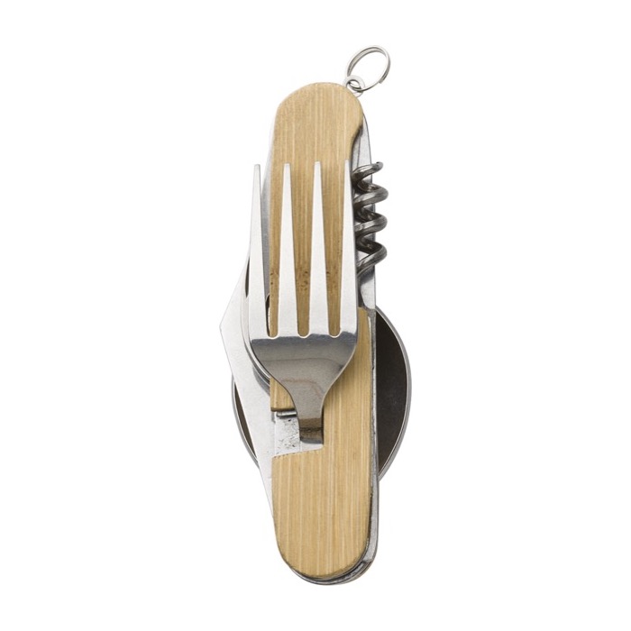 Coltellini personalizzati multifunzione che si caratterizzano per avere anche una forchetta ed un cucchiaio e per separarsi in due. Un gadget utile in campeggio.
