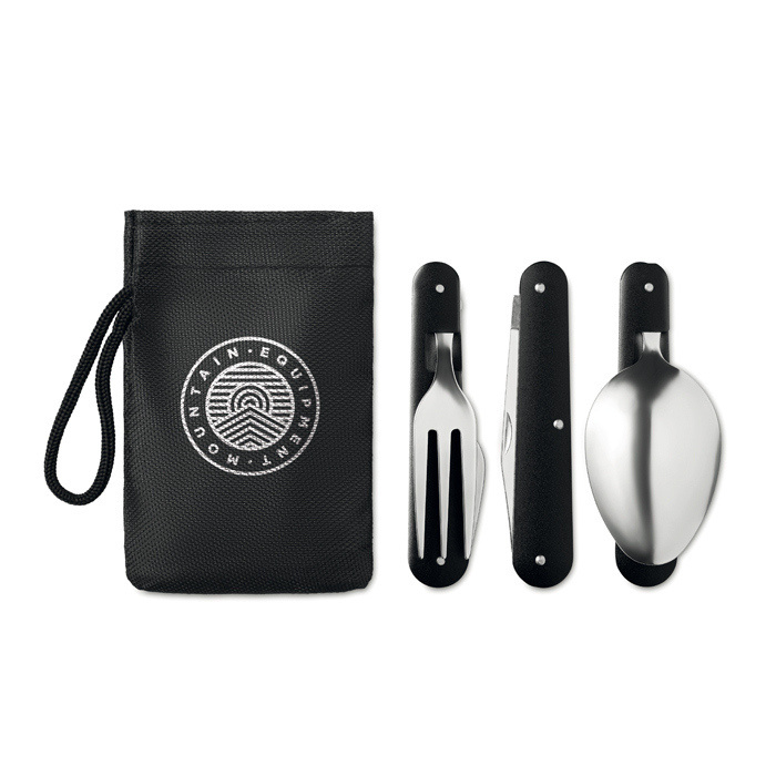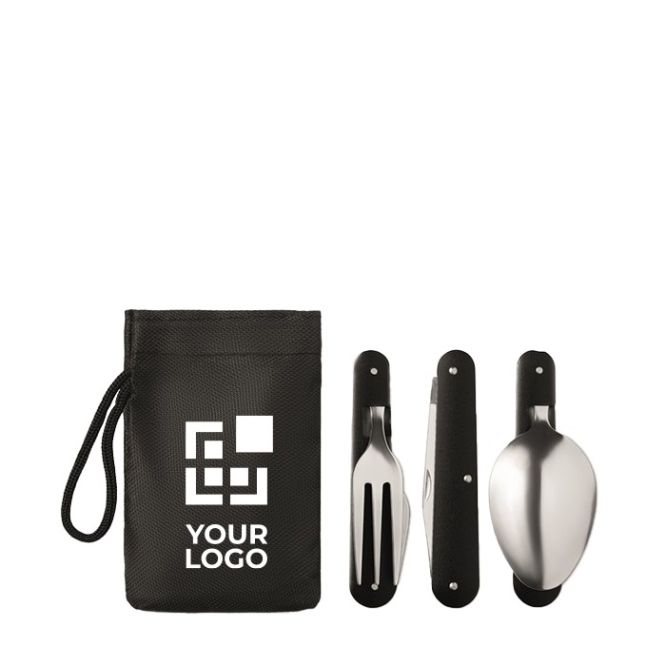 Set di posate con logo in acciaio inox in un sacchetto di neoprene nero