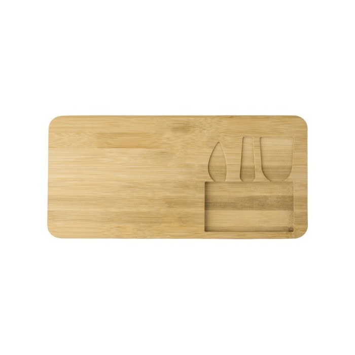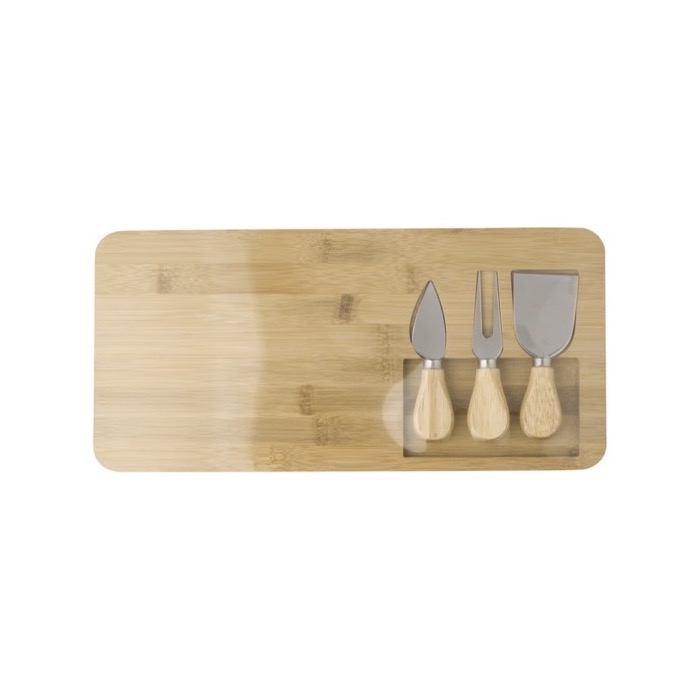 Tagliere in legno di bambù, comprensivo di tre utensili per formaggi, in acciaio inossidabile e manico in bambù. Confezionato singolarmente in scatola di cartone marrone.