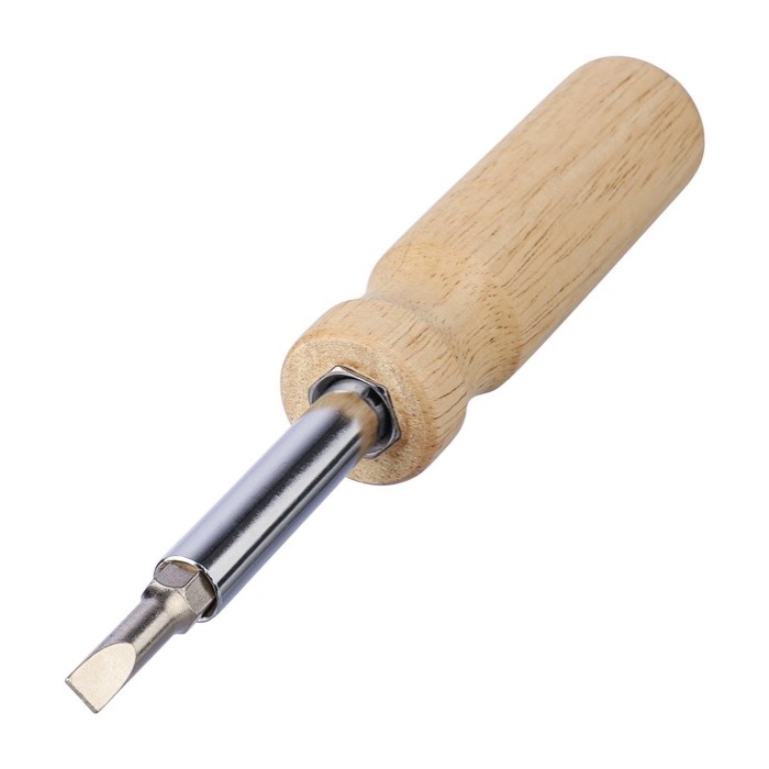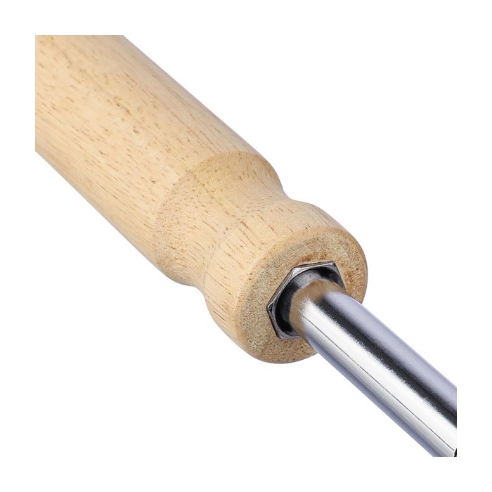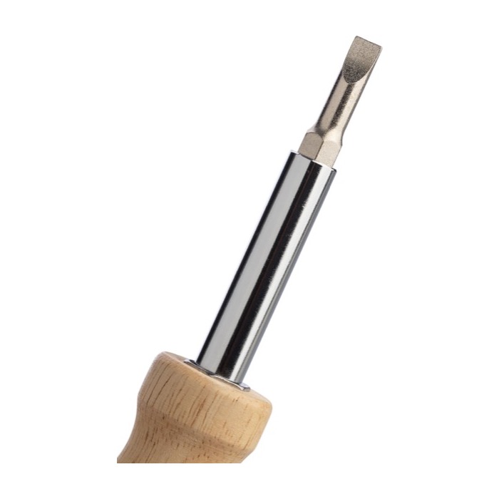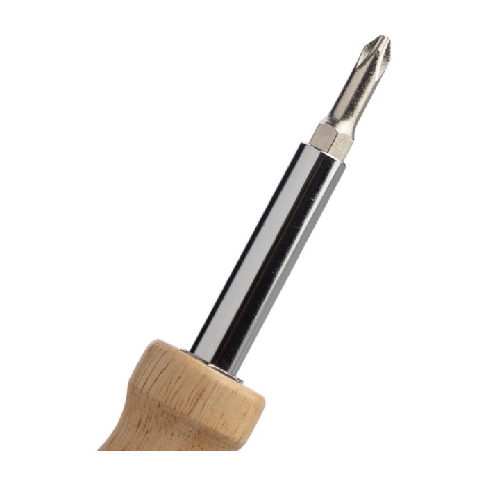Set di cacciaviti in legno e gomma con quattro punte magnetiche, distribuite su due perni bifacciali, conservate all’interno dell’impugnatura. Design compatto e pratico, con punte e supporto intercambiabili. Confezionato singolarmente in una scatola di cartone avana.