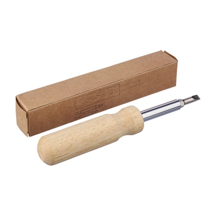 Set di cacciaviti in legno e gomma con quattro punte magnetiche intercambiabili. Un dettaglio pensato per conquistare i clienti con grande manualità.