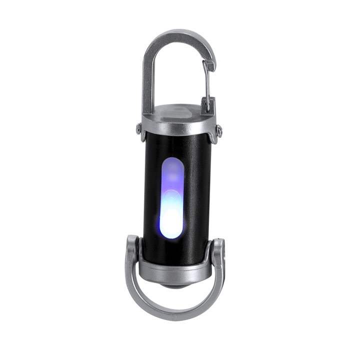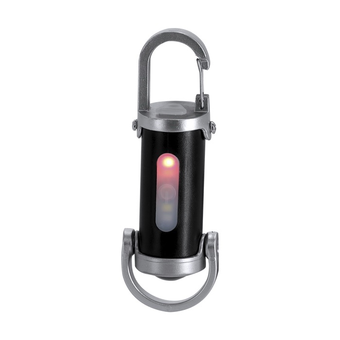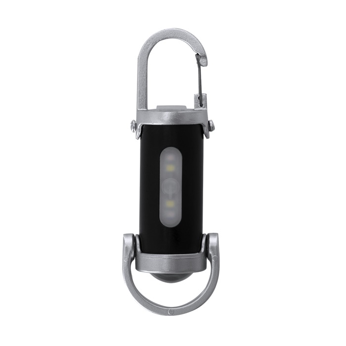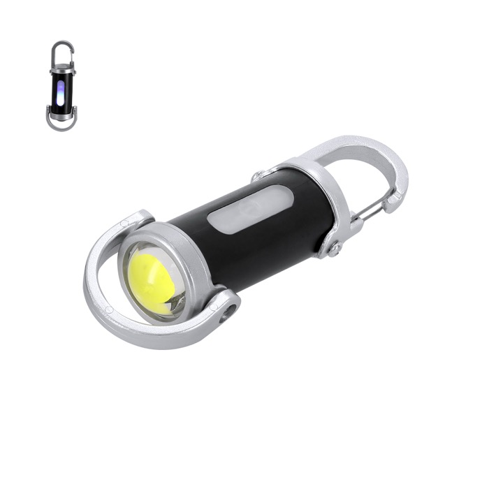 Torcia in plastica con moschettone di trasporto e manico inferiore per portarla appesa o in mano. Incorpora 4 LED e 8 luci COB, con pulsante di accensione e 7 posizioni di illuminazione, sia fissa sia intermittente, per adattarsi a diverse situazioni. Integra una batteria ricaricabile da 400mAh e viene fornita con cavo di ricarica USB-C (Universal Serial Bus Tipo C) da 5V. Risorsa pratica per attività di branding in fiere, per il team vendite o per la dotazione interna.