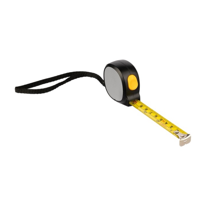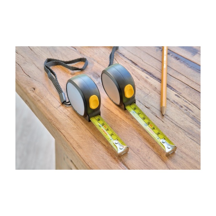 Flessometro in plastica con lato magnetico per fissarlo a superfici metalliche e avere la misurazione sempre a mano. Integra un nastro metallico largo 16 mm e lungo 3 m, con marcatura in centimetri e pollici per lavorare con diversi standard. Il pulsante superiore permette di bloccare e rilasciare il nastro rapidamente, e il laccetto in poliestere aiuta a un utilizzo sicuro in movimento. Utile per azioni di marca in fiere e team tecnici.